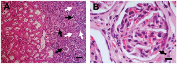 Figure 6 Histological micrographs of transplants retrieved 10 weeks after transplantation. (A, B) Regenerated glomeruli (solid arrow) and tubules (open arrow) were observed in the fetal kidney precursor cell transplantation group.68