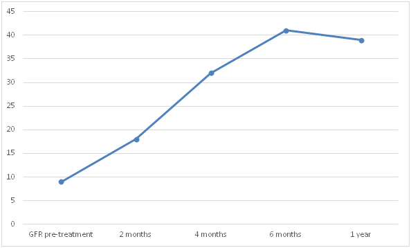 Within two months after treatment protocol was initiated we observed increase of the GFR. By the third month patient’s GFR increased to a level sufficient for the patient to be removed from regular haemodialysis (chart 2).