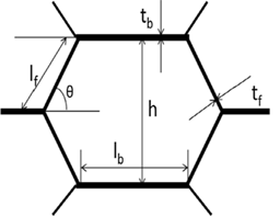 The number of picks in the required region of the honeycomb cell in the fabric can be altered to change the structural properties of the 3D woven honeycomb fabric. Free wall length (lf), bonded wall length (lb), free wall thickness (tf), bonded wall thickness (tb), cell opening angle (θ), and height of cell (h) are some of the structural parameters of 3D woven honeycomb fabric. Figure 1 depicts these factors.