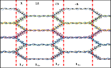 As shown in Figure 2, one repeat of a 3D woven honeycomb fabric can be separated into four sections: regions 1, 2, 3, and 4. Section I corresponds to the region of the 3D honeycomb structure where all of the fabric layers are separated from one another; section 2 is where adjacent layers join together at an alternate interval; section 3 is the same as section 1, and section 4 is the same as section 2 but with different joining layers.1 Section 1 and 4 is showing the free wall length (lf) zone, while sections 2 and 3 is showing bonded wall length(lb) zone. In the cross-section diagram, the straight line represents the weft yarn, while the curved lines indicate the warp yarns (Figure 2).