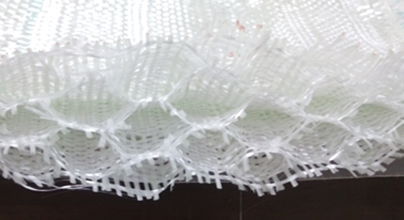 Weave design is the first and most important step in the weaving process. The designs must be compatible with a two-dimensional weaving technology. To achieve this criterion, designs are created using the double cloth principle, which consists of two unique layers that are separated from one another. Warp threads are drawn from four beams to make honeycomb fabric. The two layers of honeycomb fabric are then combined at a specific position to form a honeycomb structure. EPI (ends per inch) -10. Picks per inch (PPI)–10, the linear density of warp and weft –600 Tex. The connected wall of EPI is double that of the free wall, but the PPI remains constant. Figure 3 shows a honeycomb fabric sample with 5 picks in both the bonded and free wall zones and a 60-degree opening angle.
