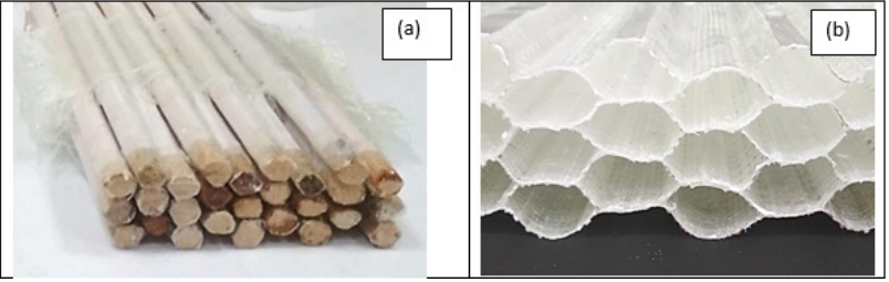 The vacuum-assisted resin infusion process was used to transform the fabric samples into composites. Epoxy LY556 (resin) and Aradur HY951 (hardener) were used to create composites. During resin impregnation and curing, the 3D shape of the preform had to be maintained. Wooden moulds were created to fit the desired shape of composites. Before putting it into honeycomb cells, a Teflon sheet was wrapped over it, as shown in Figure 4(a), so that it would not adhere to the fabric and could be easily removed once the composite was formed. Figure 4(b) depicts the successfully developed 3D woven honeycomb composite. The structural specifications of the developed composites are 12.7mm bonded wall and free wall lengths, 20mm cell height, 60-degree opening angle, 1.24mm bonded wall thickness, and 0.83mm free wall thickness.