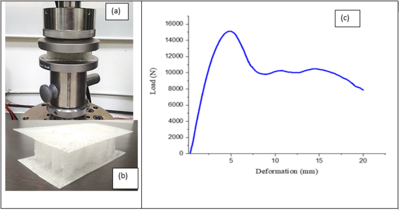 Flatwise compression testing of honeycomb composite was performed according to ASTM C365 using the Zwick/Roell universal testing equipment at a loading rate of 2mm/min (Figure 5 (a)). Sandwich panels were made using simple woven composites as upper and bottom sheets and an adhesive (Fast setting epoxy) to adhere the core to the face sheets, as shown in Figure 5(b). The core height (30 mm) and the number of cells (9) were consistent throughout the honeycomb sample. The average results are used to calculate the final findings after examining 5 samples. The energy absorption (W) of honeycomb structure was determined using equation 1 up to a strain (ε):