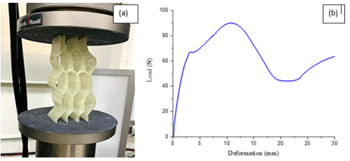 On the Zwick/Roell universal testing equipment, edgewise compression testing of honeycomb is performed according to ASTM C 364–99 with a crosshead movement of 0.5 mm/min (illustrated in Figure 6(a)). The core height (20 mm) and the number of cells (9) were consistent throughout the honeycomb samples. The average results are used to calculate the final findings after examining 5 samples. Figure 6(b) shows the load-deformation curve for the edgewise compression test. The ultimate load was determined using the edgewise compression load-deformation curve. The ultimate load of honeycomb structure for edgewise compression is 88N.
