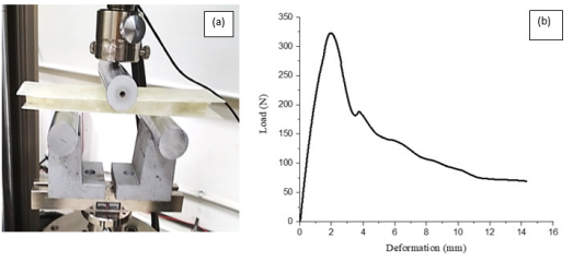 For each honeycomb composite, ASTM C 393 was utilized to evaluate the bending performance of composite samples. A three-point bending test was done on the Zwick/Roell universal testing machine at a cross-head speed of 1mm/min with a span length of 150mm (Figure 7(a)). Three rollers with a diameter of 40mm were used for the bending test. The average results are used to calculate the final findings after evaluating 5 samples. The ultimate load for a 3D woven honeycomb composite was calculated using the load-deformation curve illustrated in Figure 7(b) for a three-point bending test. The maximum load for a three-point bending test in a honeycomb sample is 330 N.