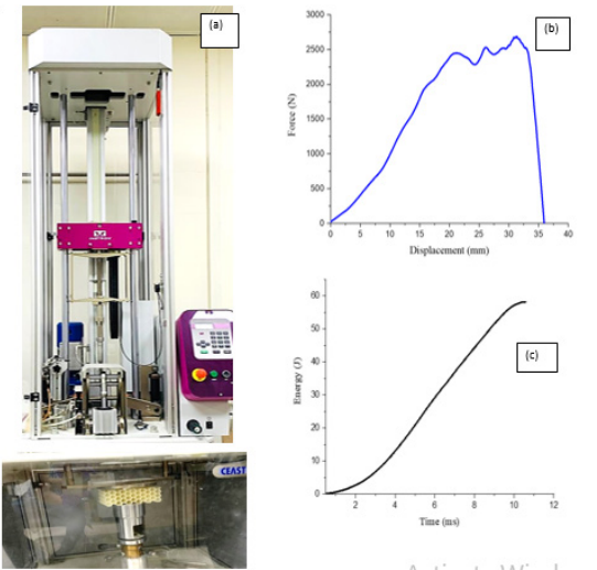 A drop-weight impact facility (INSTRON CEAST 9350) was used to conduct low-velocity impact tests on sandwich specimens in the in-plane direction, as shown in Figure 8(a). In the following data analysis, the specimen cut in square shape of 14cmx14cm, peak force, and energy absorption were chosen as the most important performance indicators to determine the effectiveness of the textile honeycomb composites. The absorbed energy and response of the Load-displacement curve (Figure 8(b)) and energy-time curve Figure 8(c) were used to evaluate the impact characteristics of honeycomb composites. After testing the number of samples (five), average values are used to calculate the final results. The ultimate load, computed from the force-displacement curve, is 2700N, and the energy absorbed by the sample in the in-plane impact is 58J, as estimated from the force-displacement and energy-time curves.
