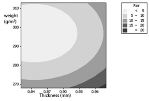 The result of the overlaid contour plot is represented in the Figure 6 for the water resistance and the air permeability. For the studied fabrics and for the objectives as represented in Table 6, Figure 6 presents the white zone for satisfying studied properties (compromise zone). According to this figure, the optimum parameters of thickness and weight, need to be respectively belonging [0.94;0.98] and [298;305].