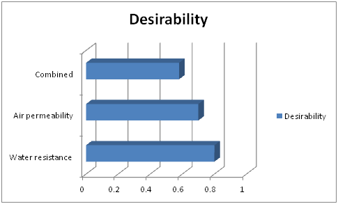 In the current study, after calculating individual desirability (di) for water resistance and air permeability, as described in the formula (1) and (2) we have combined them to provide a measure of the composite, or overall, desirability, that desirability are given in the Figure 7. This measure of composite desirability (the combined desirability) is the weighted geometric mean of the individual desirability for the studied properties.