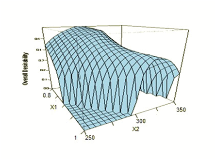 Most researchers use a graphical approach of superimposing the different response surfaces and finding the experimental region that gives the desired values for all response variables simultaneously. This methodology, although visually attractive, is inefficient and cannot be automated for this reason; optimization of the selected properties by the desirability function will be done.
