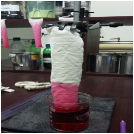 Wicking test: A cotton material strip (18cm 5cm) was suspended higher than the H2O surface during a glass beaker such the horizontal bottom edge touches the surface of the water. A spontaneous wicking was discovered thanks to capillary force. The peak of the liquid rise boundary was recorded for five, 10,15,20,25,30 minutes.