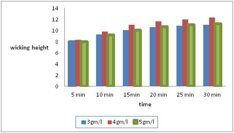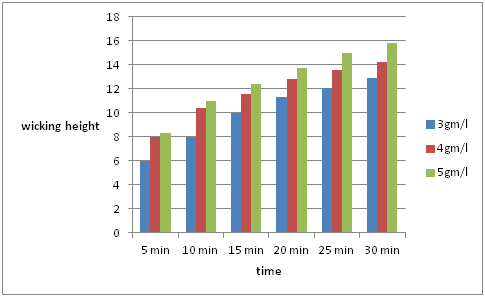 In this test, we have observed that for 3g/l bio scoured sample the wicking height was 6cm, 2cm, 2cm, 1.3cm, 0.8cm, 0.8cm and for 4g/l bio scoured sample the wicking height was 8cm, 2.4cm, 1.2cm, 1.2cm, 0.8cm, 0.6cm. and for 5g/l bio scoured sample the wicking height was 8.3cm, 2.7cm, 1.4cm, 1.3cm, 1.3cm, 0.8cm after 5,10,15,20,25,30 min respectively (Figure 1) (Figure 2).