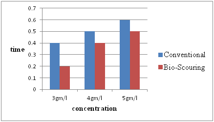 For Bio-Scouring sample time to absorb the colored drop was 0.2, 0.4,0.5sec for 3g/l, 4g/l, 5g/l respectively (Figure 4) (Figure 5).