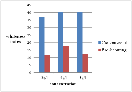 Whiteness index: For caustic scoured whiteness index is 36.84,40.55,40.11 for 3g/l, 4g/l, 5g/l respectively and for Bio- scoured whiteness index is 11.64,17.56,12.29 for 3g/l, 4g/l, 5g/l respectively.