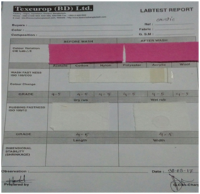 Colorfastness to wash: For Conventional scouring dry rub grade is 4-5 & wet rub grade is 4-5 according to the grey scale (Figure 9).