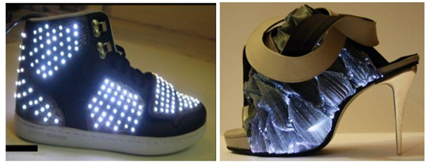 Lately, LED and solar solutions have been made into wearable technology in the form of clothing and shoes in the fashion industry.36 Indeed, fashion designers are using LEDs and solar panels in their products for sale in retail stores and online as well.37 Levi's Fashion Futures and Sony Global Company have developed a scenario for 2025 based on problems, such as water and material shortages and climate change, which actually reduces water usage during production.38 Other Eco-fashion designers are developing fashion items incorporating the light-emitting diode (LED) into their clothing, accessories, and shoes (Images 7)5 (Image 8)6, and are also developing solar clothing using flexible solar cells (Image 9)7 (Image 10)8.