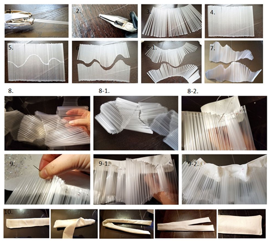 Raw material: The Empress Dress was developed with recycled plated plastic water bottles. The lower part of about 160 bottles was melted with candles to create a flower shape. In addition, lots of crystal beads and hotfix stones were used as elegant decoration (Table 4).
