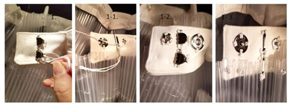 Closure of the dress: For a closure, the empress dress was opened in the center front of the dress. Ten sets of size four nickel-plated brass snap buttons were used for an effective way of finishing. All of snap buttons were attached using fishing wire by hand sewing (Image 26).