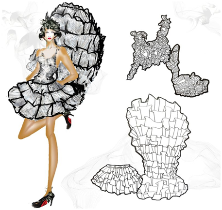 Showed emphasis of skirt and repetition using circle wholes of top. |