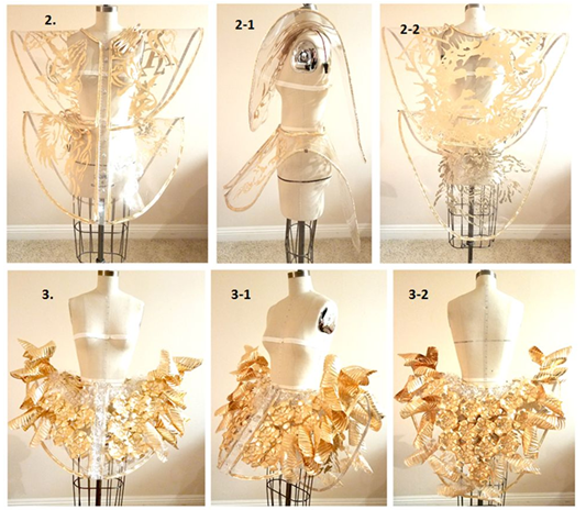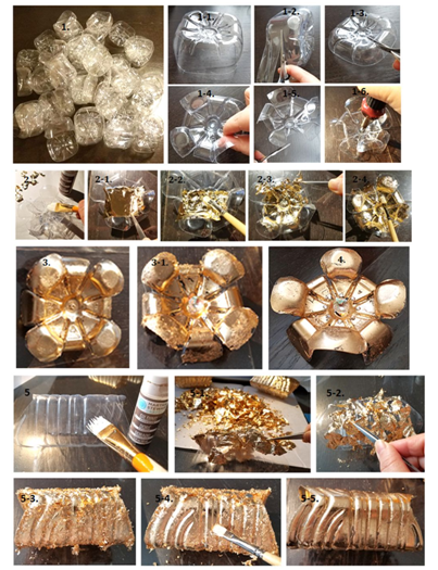 Procedure of dress material preparation: Empress Dresses were made of two sizes of recycled water bottles, which were made into a flower shape and gold-plated with gold leaf gilding to emphasize the value of recycling.
