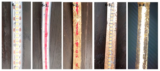 Developing empress dress: When all the materials are ready, make dress patterns, and then cut the PET panel using paper patterns, and draw a pattern on it to make gold. Gold plate the LED light in both virtual places and attach using the fishing line and the crimp bead at the end. Gold-plated LED light and flower-shaped recycled water bottles were placed on both sides of the virtual spot on the prepared PET panel. Attach all prepared recycled water bottle flower shapes to the main dress using a fishing line and crimp bead. Sew the inner lining dress with a lace and tulle cloth using a pattern, and sew with a sewing machine (Image 26).