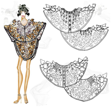 Final pictures and illustration: The illustration and flat sketches of the empress dress were developed as follows on Image 27. To emphasize the importance of the water crisis, the dresses were feature gold color, emphasized by the use of LED light to express the importance of further utilization of recycled water bottles (Image 28).