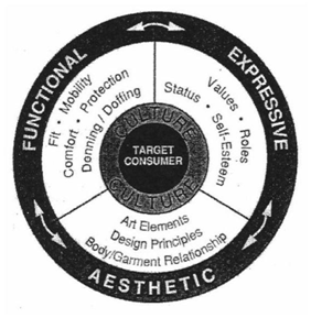 This chapter has adopted the theoretical framework of the Functional, Expressive, and Aesthetic (FEA) Consumer Needs Model to analyze the collection created by Lamb and Kallal in 19921 (Figure 2). The model consists of three parts: functional, expressive, and aesthetic with the target consumer as the center of a circle. Each dress utilizing a theme of environmental pollution was analyzed by applying the FEA model. The functional aspect of clothing item consists of its fit, and closure characteristics suitable for a particular idea for which the garment was made. For the fitting the body, the representative dresses used a princess line to emphasize femininity and elegance. All of the dresses were finished using hook and eye, zippers, fishing wire, crimp beads, and snap buttons, which met the element of functionality needs of dress for the FEA Consumer Needs Model. The expressive aspect of apparel consists of pursuing and expressing awareness of environmental issues. Most of the materials used were recyclable plastic such as 500-milliliter polyethylene terephthalate (PET) water bottles, recycled parts of one gallon high-density polyethylene (HDPE) water bottles, and clear plastic drinking straws. Lastly, the aesthetic aspect of a garment consists of design principles and elements, and harmonizing and balancing the body and the garment relationship. The dresses were constructed based on design elements, such as point, line, shape, form, space, color, and texture, and design principles, such as emphasis, balance, rhythm, harmony, proportion, perspective, movement, pattern, repetition, variety, and unity. Thus, aesthetic view of a garment concerns beauty for consumer’s desires.1,2 The concepts for all of the dresses were filtered through cultural perspectives such as sustainability and consumer’ awareness of issues related to the global water crisis. In addition, target consumers want to know how to combine sustainability and technology through fashion, which gave the fashion designers and fashion industry professionals motivation. Now, the FEA Consumer Need Model has been designated to analyze general characteristics of avant-garde garment products in this study.2