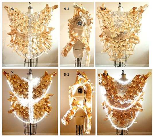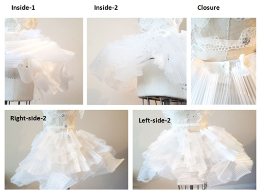 FEA theoretical framework: Design analysis of the empress dress adopted the three elements of functionality, expressiveness, and aesthetics. Inner lining dress was focused on fit and closures were used to fit the body of the customer using a zipper and main dress used several snap buttons as closure for a functional aspect. For expressive aspects, the empress dress was represents the related water shortage and environmental issues as inspiration for using recycled plastic material. Aesthetically, this dress uses design principles by emphasizing the use of gold color and crystal beading, and balance, repetition and rhythm have been used as a design element by the stacking of recycled water bottles in various shapes. Aesthetic and expressive aspects were the focus rather than a functional aspect here. The analysis of the empress dress is listed on Table 5