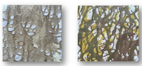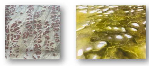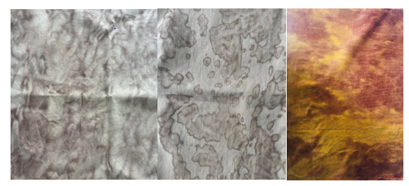 By using other methods, such as the application of fixing agents with varying concentrations, we achieved different effects. Unlike dyeing, where the extracts are water-soluble natural dyes, in this second experiment, they are used as pigments. Indeed, these pigments are well known in the field of pigment printing.