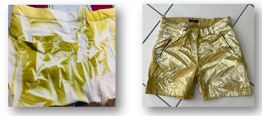 To give our fabrics an ancestral appearance, we integrated other techniques, mainly the manual wrinkling technique. After fixing this wrinkling effect with the press, we spread the solution on the fabric using a spray gun. The folds prevented the paste from penetrating the entire fabric, resulting in an effect similar to that of Tie and Dye (Figure 4).