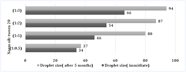 For reducing droplet size of neem oil, sonication time was found more helpful than surfactant concentration as it can be seen from Table 1. On increasing sonication time from 45min to 60min for the similar neem oil, surfactant ratio gives approximately two times neem oil droplet size reduction, on the other hand on increasing surfactant concentration from 1:0.5 to 1:3 for 45min sonication time resulting in droplet size reduction with the ratio 2, while for 60min sonication time decrease in droplet size was in the ratio 1.9.