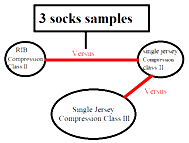 Three type of compression socks were purchased and structurally analyzed at the ankle portion with great precision and accuracy. Here, we selected and compared 2 socks samples (single jersey and Rib knit) of same compression level, Class II and one socks sample of compression class III (Single Jersey) compared with compression class II (single jersey) as shown in below given flow chart (Figure 1). These custom-made socks samples readily available for patients were analyzed rather to develop.