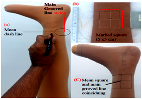 Firstly, we put-on all the socks samples on leg and marked a line at 12cm height from the floor as a mean line and then unworn the socks and keep flat on table for relaxation. After relaxation, we marked a square line of dimension (5×5cm2) on face of each compression socks samples named as BIISJ, BIIISJ and DGIIRIB as shown in Figure 2. Here, B and DG stands for beige and dark grey color while II and III as compression levels while SJ and RIB stands for single jersey and rib knit types. All the three pairs of socks samples were worn on wooden leg (Circumference: 23cm) simultaneously and tested for dimensional change and compression pressure measurement. Each pair of socks was cut to strips of each dimension (8×5cm) simultaneously to hang on tensile testing machine.