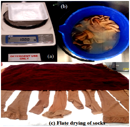Before testing for tensile characterization, all socks cut-strip samples were gentle detergent based hand washed. Washing was performed by dipping all the socks samples in solution of 4 liters of normal water and 8 gm of ECE detergent (non phosphorous and without Optical brightening agent) and mixed thoroughly as per Australian guidelines AS-2001:5-2005. As per standard, all samples were flat dries by placing all the pairs of socks samples between layers of towels as shown below Figure 3 for 24 hours under standard atmospheric condition (RH, 65±5%, temperature, 20±2˚C).13