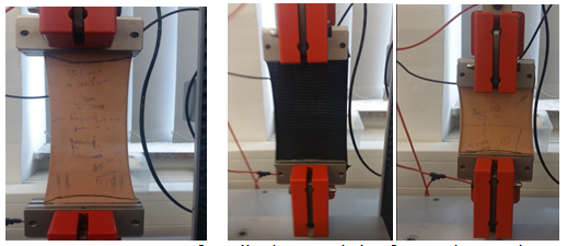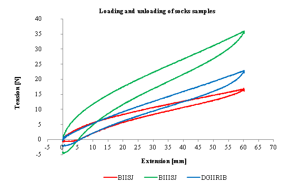 Harpa et al.2 studied the tensile and rheological features of compression socks before use, after 15 and 30 wearing-washing cycles in wales direction using Mesdan Tensolab. He proposed Grab test method as real simulator of durability assessment of compression socks. He concluded that the proposed testing (Grab test) method can be used to assess the graduated compression socks by measuring the deformation resulting in traction tests in three directions under two different levels of loads (Fmin 0.65N and Fmax 1.2N) but still gap he could not fill about hand washing of socks samples or cut strips, why he selected 100 mm/mint rate of extension in his study.2