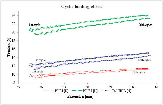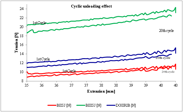 We observed from the Figure 6 and Figure 7 that at 1st cyclic loading, tensile force was higher against each socks strip samples BIISJ, DGIIRIB and BIIISJ which was declined to lower value with increasing number of cycles. At 20 cycles, there was a significant decline due to fragility of elastane thread double covered by polyamide multifilament.
