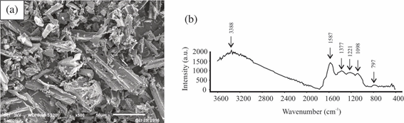 The specific surface area (SSA) was measured by BET/N2 adsorption, using a Micromeritics ASAP 2010 instrument. According to the Brazilian Association of Technical Standards (EB-2133-ABNT, 1991), the iodine number was measured (in mg I2/g of AB), which determined the adsorption characteristics of AB. The infrared spectrum of AB was determined by ATR FT-IR (Varian), with a wavelength range from 400-4000cm-1. Finally, the morphology of AB was identified using a Scanning Electron Microscope (SEM, JEOL JSM-6010LA).
