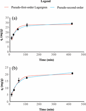 Figure 3 qt versus adsorption time of RB19 by AB at pH 2 (a) and 5 (b) adjusted by pseudo-first order Lagergren and pseudo-second-order. Bars indicate standard deviation.