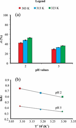 Figure 4 Adsorption of RB19 by AB at different temperatures (a) and van't Hoff chart (b). Bars indicate standard deviation.