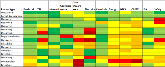 Figure 1 Comparison of different chemical recycling systems with alternative partial degradation and dissolving concepts in several process aspects; from very good to less desired in color code from dark gree, green, yellow, orange red to dark green (worst).