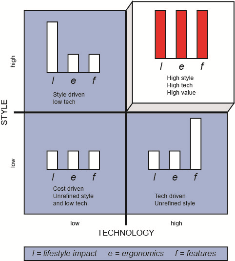 The products positioned in the upper right are thought of as the breakthrough products that integrate style and technology effectively to create high value. These products generally combine innovative technology, perfect style with good aesthetic shape and appearance or ergonomic feature. Based on the integration of high styling, technology and value, these products often have a strong competitive advantage and relatively stable consistent markets.