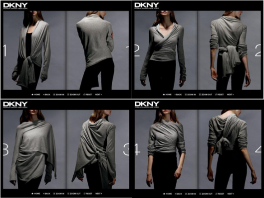 To propel the flexibility of clothing, some fashion brands develop and launch convertible clothing to the markets. These kinds of garments can be worn in multiple ways due to their particular structure. Even though the garment has a certain structure it can be worn in different ways relying on the softness feature of the fabrics and particular structure to form various shapes. Through the flexibility in wearing, this particular kind of garment enables recreation by the user to construct various shapes which look like different styles from just one piece of clothing. This co-design in the wearing of clothing can be exemplified by a kind of cosy dress that was marketed by the fashion brand DKNY around 2004. This kind of cosy dress was asserted as the twelve gifts for Mother Day (Figure 2). They can be worn in twelve ways through which related twelve styles can be created according to individual customer preferences. This multi-wearability of the convertible clothing not only satisfies the desire of the price-sensitive customers but also provide opportunities for the customers to experience the redesign of their images through one piece of clothing.