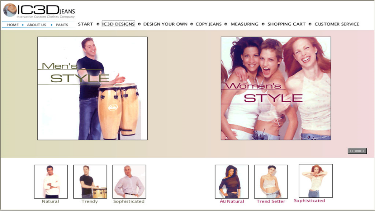 Furthermore, co-design is one of the primary approaches to achieve mass customization strategy in the fashion industry because garment customizing cannot be realized without the engagement of customers in the process of fashion apparel development.2,17 In order to create distinctive looks, fashion apparels always need to be customized in terms of type, style and specification. Since the early twenty-first century, there have been some online-based clothing customization companies emerging. For example, the IC3D company offered an online jeans customization service (Figure 4). Through the online bespoke platform, consumers can select different types and styles of jeans based on the jeans product and parts families. Some design details such as fabric, shape, fly, packages and thread, etc. can be selected by the consumer through visual illustration and text description. Furthermore, the customizing system can support the customer to input personal sizes to tailor the jeans measurement. Based on the jeans modules in terms of style and specification, customers can select the enabling style elements to identify the completed shapes and appearances then decide to make an order. The modularized jeans components with a variety of combinations not only create customizing value to customers but also can help the producer to retain similar efficiency of mass production.