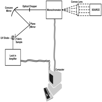 Fabrication of instrument for evaluation of UV transmission: The instrument was based on direct optics Figure 1. Light was generated through a tungsten halogen lamp (Its intensity is closely matches the solar spectrum. The light passes through the monochromator). Mono chrometer only passes UV rays with particular wavelength. Optical chopper converts this UV rays into pulses and the alternating current passes through the concave mirror to focus the light. The light is directed towards the plane mirror from where the light passes on the fabric where the transmitted light is detected by a UV diode (It respond similarly to human skin) It allow the flow of current in one direction toward the lock in amplifier, which amplifies that signal to certain level converting 0-5V signal to computer. The fabric sample was placed 0.05cm away from the UV diode. The whole set up was programmed on the computer by the Lab view 7.1 software. The computer screen directly showed the graph between wavelength and transmittance and transmittance percentage was calculated by the following formula: