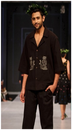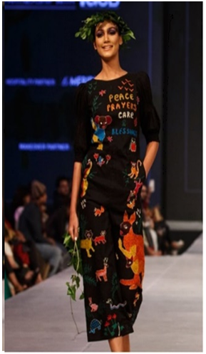 Bangladesh is a country for rich culture and its customs values whole over the world.12 Due to the British influence during colonization, shirt-pant and suits are very common for men’s wear. Shari is the main and traditional dress of Bangladeshi women. Salwar kameez is usually preferable to young lady. The traditional fashion elements motif adorned with the dress by printing, embroidery, applique and hand stitching technique enhance the interest of clothing. Designer Afsana ferdousi in Garnet magazine 2020, has introduced traditional cultural elements motif in her collection (Figure 3) (Figure 4). The hand stitching and embroidery technique applied on the dress to make it fashionable with cultural elements.