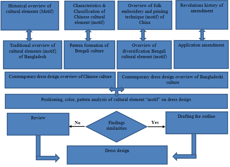In this methodological framework, the author wants to show the total research outline. At first, the author has reviewed the total cultural elements between two countries to classify and define the cultural elements (motif). In this process of review, the authors also investigate the embroidery and printing design history for getting cultural elements, pattern design, diversified cultural elements (Motif) and also the applications. After the analysis, the author finds from this research some elements like Positioning, color, pattern and motif characteristics. The research team analyzes those points from the view of two sides. Then the authors finally find out the key similarities from the analysis between two cultures. From the finding, the author designs a series of dress for the Contemporary market for future sustainability. In below, the Figure 5 shows the total overview of the thought of the research.
