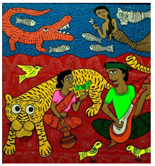 Bangladesh: Alphana, Potchitra, Nakshi Katha are the common and popular form of motif application in Bangladesh. Alpana explain itself as a colorful motifs applied as the form of holy art in Bangladesh like Puja, wedding or special community events (Figure 8). Potchitra is the symbolic form of folk tales as well as religious tales like Jatok story, the love affair of Ramayana, Krishna, Beulah, story of Mohorrom, myth of Lakhindar, Sonai Madhob etc (Figure 9). Nakshi Katha is a form of embroidery quilt where materials are thread, needle and double layer of cloths (Figure 10). Decorative motifs on Nakshi Katha illustrate narrative and abstract thoughts.15 Apart from this three type of media, motif also applied in pottery, sculptor, wall painting, furniture etc.