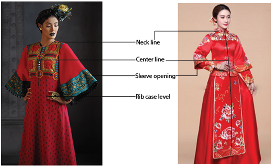 The application and positioning of motif to the clothing is not similar. Several positioning helps to create different outlook and features, in fact it’s changed as per pattern and cutline. For instance, In Bangladesh Motif elements are used at neck line, rib case level, sleeve hem and sometimes throughout the whole garments (Figure 11). On the other hand Motif mostly used in Chinese clothing to the neck line, bottom of sleeve , waist line and center to princes line with long continuous repetition of elements (Figure 12).