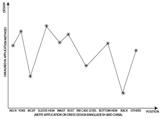 Position report: The following diagram (Figure 13) depicts the motif placement in neck line, waist level and bottom hem level has moderate use in dress design where sleeve hem, yoke and bust level is top priority to the designer. There are less application in back and bicep position. This statistics has been created from the design analysis of different fashion brand home and abroad.