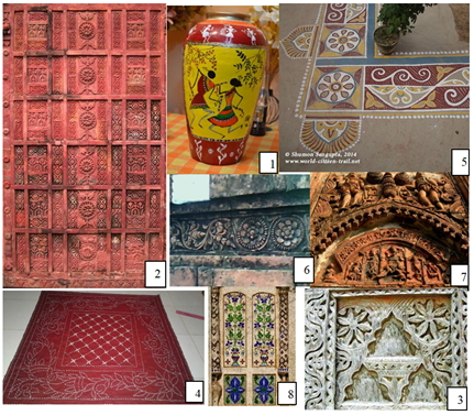 Source of inspiration; Bangladesh: The images have been taken as the form of inspiration or the evidence of cultural elements Bangladesh. Images included wooden craft, pottery, street painting, terracotta, Nakshi kantha, door painting and Building painting which represents the cultural elements uniformity (Figure 16). In all reference images have different shape, color and construction to reflect the authenticity of motif in Bangladesh.