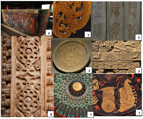 Source of inspiration; China (Han): Chinese (Han) tomb, wooden furniture, wooden painting, terracotta, pottery, wall painting and liquor work has been taken the form of inspiration. The images reflects the characteristics, pattern, color and shape of Chinese Han cultural motif. The repetitive pattern of flower, animal, typography or their blending has created a complete object to furnish individual products (Figure 17).